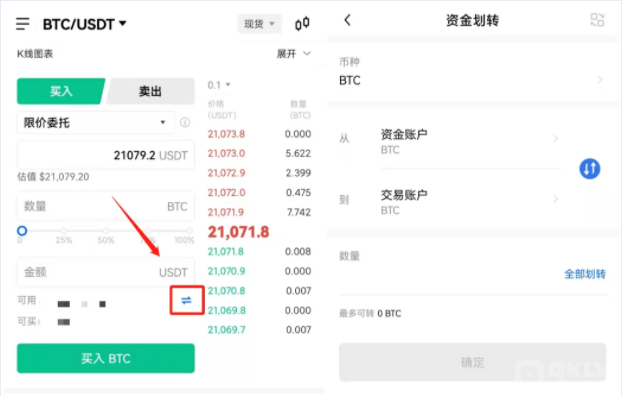 在交易页面,点击划转按钮。选择币种,以【BTC】为例—从【资金账户】—到【交易账户】—输入划转【数量】—【确认】。