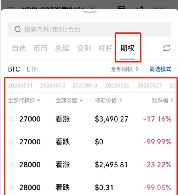 1)在交易页面点击币对切换按钮,在【期权tab】下选择简选模式